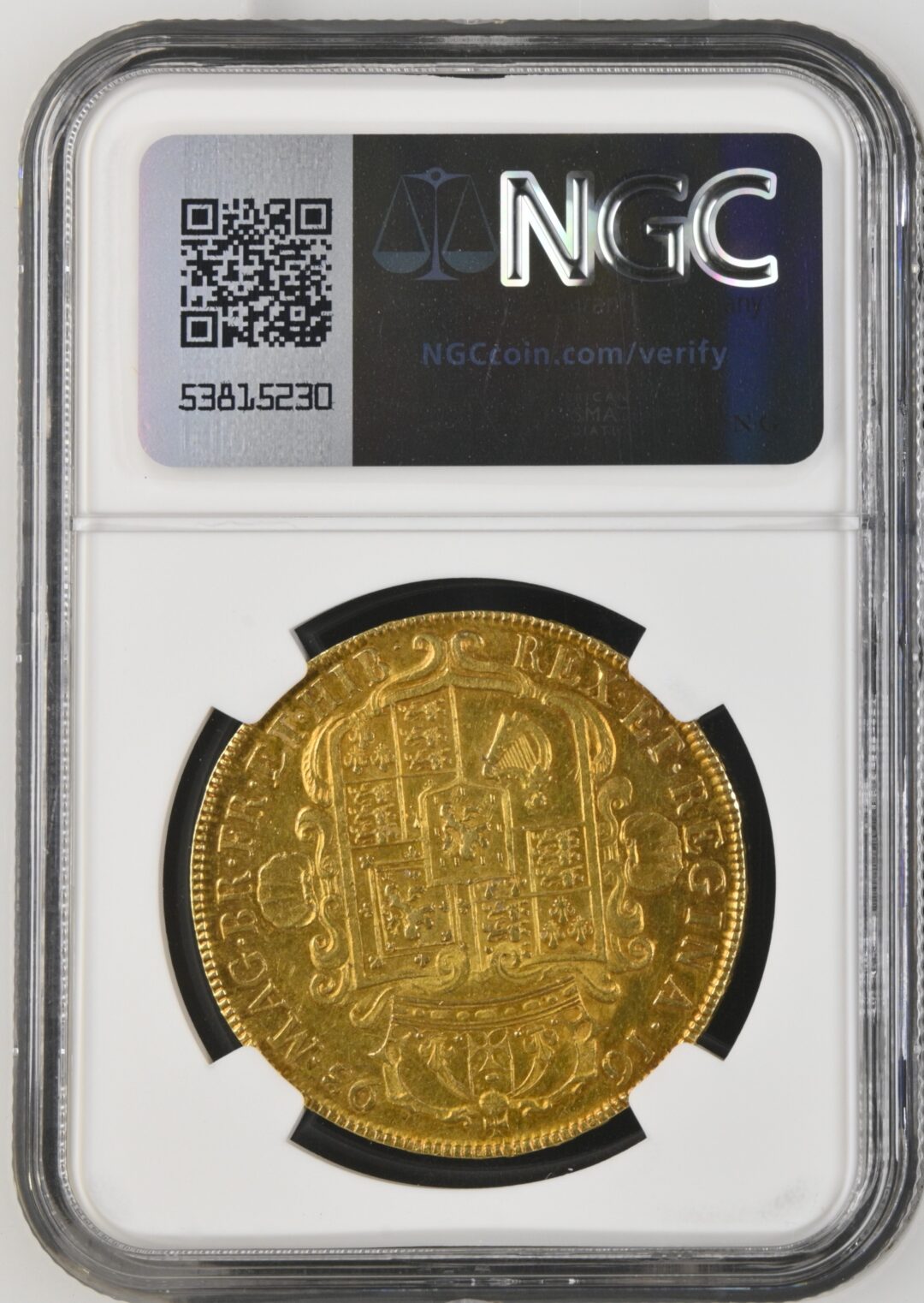 1693年銘は縁(エッジ)に在位年号「QVINTO」を刻むタイプとして知られます(QVINTOエッジ)。本品はNGC鑑定MS62+で、未使用グレード(Mint State)の中でも上位の評価を示す個体です。
