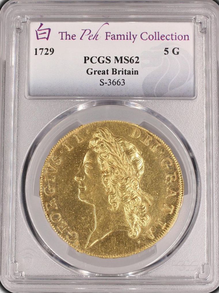 1729年ジョージ2世5ギニー金貨 PCGS MS62 Pehコレクション