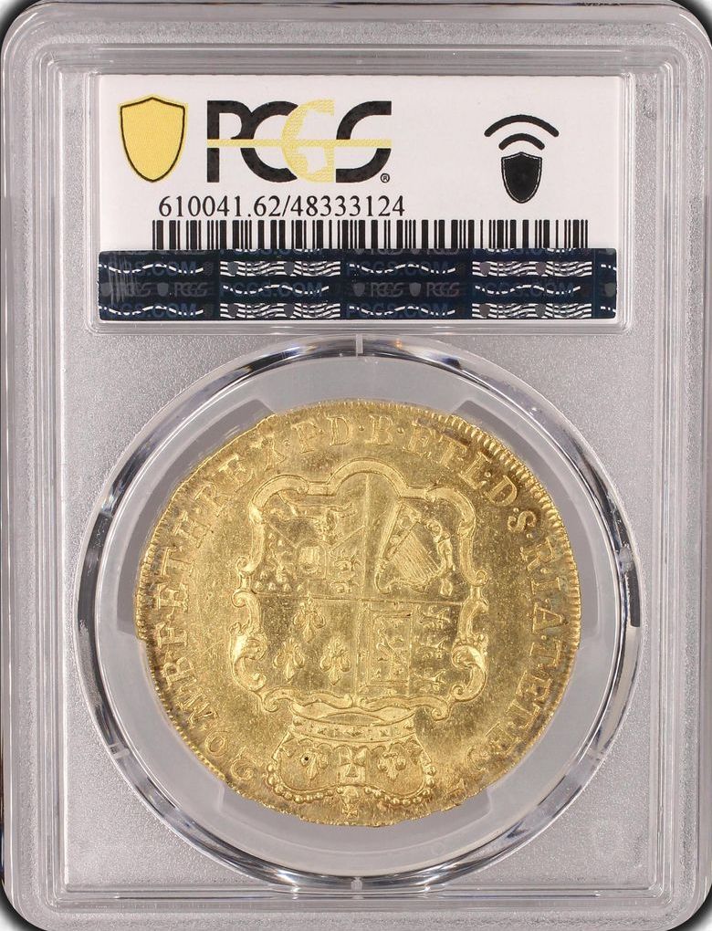 本品はPCGS鑑定でMS62(未使用グレード)に認定された個体で、「Pehコレクション(ex Peh collection)」来歴として紹介されている5ギニー金貨です。