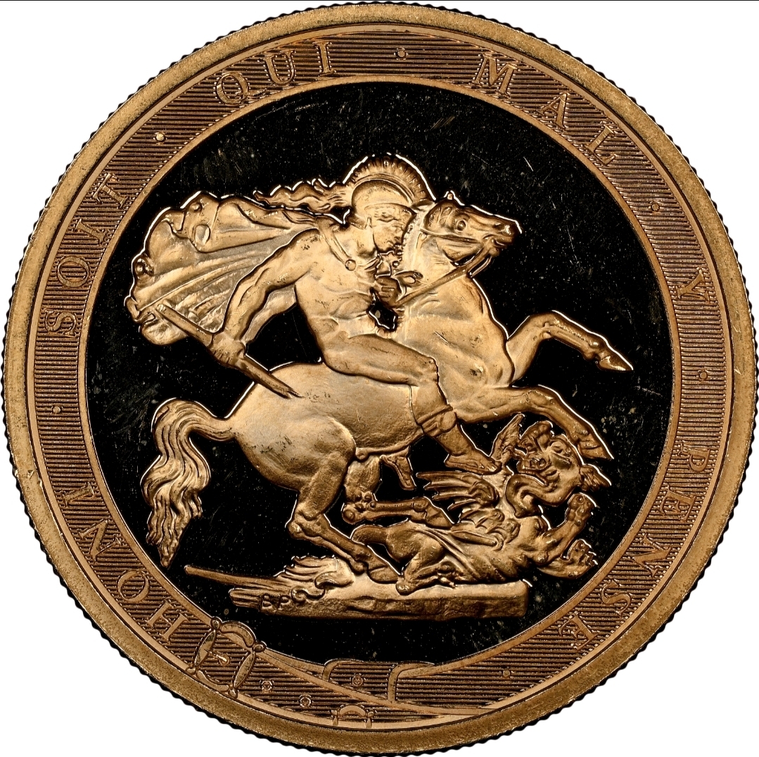 裏面には、馬に乗り折れた槍を持つ聖ジョージの姿が描かれ、その周囲にはガーター(帯章)があり、モットー
